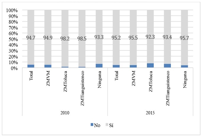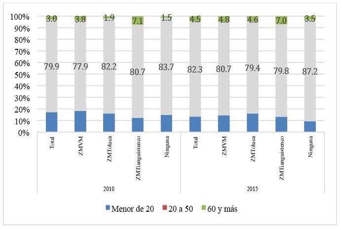 En lo que toca a los migrantes de retorno menores de 20 años, en 2010, su proporción es mayor en la ZMVM (18.3 por ciento), lo que sugiere que el acceso a centros escolares de diversos niveles puede ser un criterio para seleccionar el lugar de destino al retorno. En el año 2015, es la ZM de Toluca la que concentra el mayor porcentaje de personas retornadas en el rango de edad de menores de 20 años.