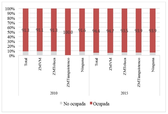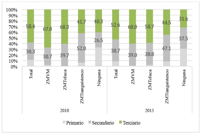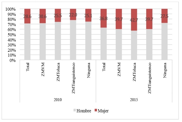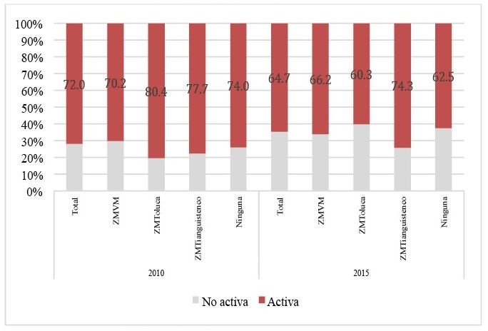 Conforme a dicha Figura, en 2010, de la población en estudio, 72. por ciento es económicamente activa en el conjunto de la entidad; 70.2 por ciento en la ZMVM; 80.4 por ciento en la ZM de Toluca; 77.7 por ciento en la ZM de Tianguistenco; y 74 por ciento en los municipios no metropolitanos. Lo que sugiere que la actividad económica es más dinámica en el conjunto de municipios que componen las zonas metropolitanas más ligadas al centro político-económico de la entidad. En 2015, la población retornada económicamente activa disminuyó a 64.7 en el Estado de México, este comportamiento es replicado en las tres ZM y los municipios no metropolitanos. Esta disminución en la población retornada económicamente podría estar relacionado con el aumento de mujeres retornadas, esto en función que ellas tienen tasas de actividad económica menores a las de los varones.