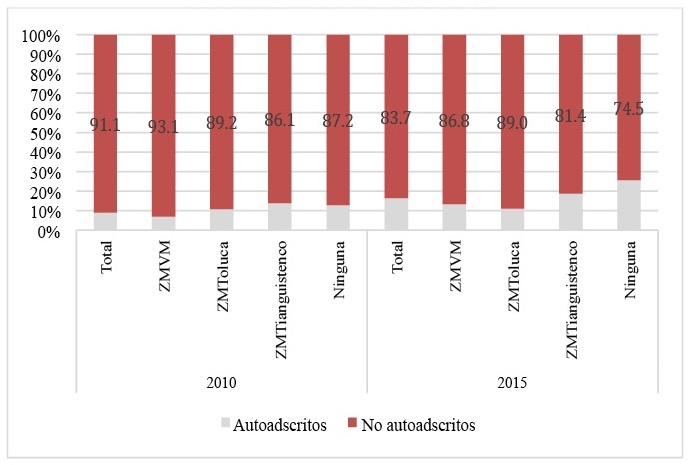 En la Figura 27 es posible apreciar que 8.9 por ciento de los retornados en el Estado de México dijeron pertenecer a una cultura indígena. Considérese al efecto que sólo 2.2 por ciento se declararon como hablantes de lengua indígena. En esa tesitura, en 2010, llama la atención que en tanto en la ZMVM 6.9 por ciento de los migrantes de retorno fueron auto-adscritos a una cultura indígena, la proporción es mayor en la ZM de Toluca (10.8 por ciento) y los municipios no metropolitanos (12.8 por ciento), así como en la ZM de Tianguistenco (13.9 por ciento). En el año 2015, el porcentaje de población retornada que se auto-adscribió como indígena aumentó de forma notoria. En el Estado de México el 16.3 por ciento de los migrantes retornados auto-adscribió como indígena. Es la ZM de Tianguistenco y los municipios no metropolitanos los que tienen los porcentajes más altos de población indígena retornada (18.6 y 25.5 por ciento, respectivamente). Incluso en las ZM restantes el porcentaje de población indígena supera diez por ciento.