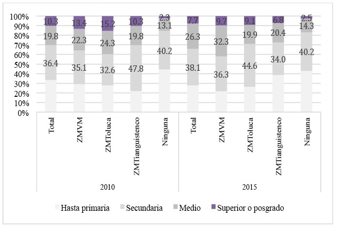 A su vez, en la Figura 29 es posible apreciar que, en 2010, en el conjunto de la entidad la proporción de migrantes de retorno que tienen hasta primaria es de 33.4 por ciento. Dicha proporción es más baja en las tres zonas metropolitanas de la entidad (29.3 por ciento en la ZMVM; 27.8 por ciento en la ZM de Toluca y 22.1 por ciento en la ZM de Tianguistenco) y mayor en el conjunto de los municipios no metropolitanos (44.4 por ciento). En 2015, en el Estado de México el porcentaje de población retornada que tiene hasta primaria es de 27.8 por ciento. Siendo el porcentaje menor en la ZMVM (21.7 por ciento) y el mayor en los municipios no metropolitanos (42.9 por ciento).