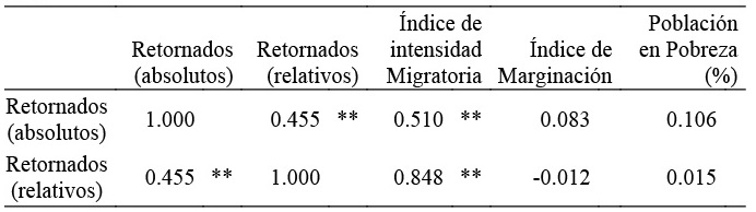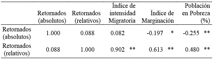 Un aspecto a considerar, es la relación o correlación de los indicadores de migración de retorno expuestos, con otros indicadores de interés.