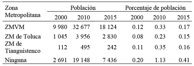 En el caso de la ZMVM, el volumen de población de cinco años o más que radicaba en Estados Unidos un lustro antes, pasó de 9 980 a 32 677 personas entre 2000 y 2010, representando 0.12 y 0.33 por ciento del total de población en ese grupo de edad (población de cinco años o más), respectivamente. En la ZM de Toluca los valores cambiaron con igual tendencia de 1 045 a 3 956 personas y de 0.08 a 0.23 por ciento; mientras que en la ZM de Tianguistenco el cambio ocurrido es de 112 a 495 personas y 0.11 a 0.35 por ciento. En el caso de los municipios no metropolitanos se observa un cambio más notable, pues en el mismo periodo pasó de 2 691 a 19 148 personas y de 0.20 a 1.13 por ciento (Tabla 4). Es importante señalar que este comportamiento ascendente observado en el año 2010 no se ve reflejado en ninguna de las Zonas Metropolitanas en 2015, aunque es preciso mencionar que, aun cuando la migración de retorno disminuyó términos absolutos y relativos en 2015, los niveles son mayores que lo observado en el año 2000.