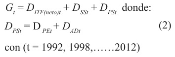[e2]En donde G representa el coeficiente de desigualdad de Gini de ingresos familiares. DITF(neto)t simboliza la desigualdad generada por los ingresos de los hogares neto de jubilaciones/pensiones y programas sociales de protección contra la pobreza. A su vez, DSSt y DPSt representan —respectivamente— la desigualdad generada por los ingresos obtenidos a través de jubilaciones y pensiones (seguridad social) y mediante la percepción de programas sociales. La desigualdad que se deriva de los programas sociales de asistencia directa y protección al desempleo se conforma, a su vez, por la ocasionada por los programas de empleo DPEt y la correspondiente a los programas de transferencias no laborales o asistencia directa DADt. El subíndice t simboliza el tiempo.