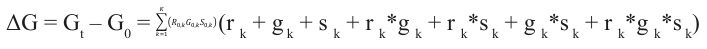 Según esta ecuación (3), la contribución de una determinada fuente al cambio general de la desigualdad estará determinada por: (i) los cambios en la correlación entre la distribución del ingreso familiar de un determinado origen con respecto a la distribución total del ingreso (R); (ii) el cambio en la concentración relativa del ingreso por parte de cada fuente considerada (S); (iii) los cambios que registre la desigualdad al interior de cada fuente (G); y (iv) el efecto de cada una de las correlaciones de primer y segundo orden entre estos factores. En nuestro caso, el factor común que reúne la suma (R0,kG0,kS0,k) representa la magnitud del aporte de cada una de estos factores a la formación del índice de Gini del ingreso familiar en el tiempo base. Las variables rk,, gk y sk son las tasas de crecimiento lineales simples para cada fuente de la correlación de Gini, de los índices de intradesigualdad y de las participaciones de las fuentes en el ingreso monetario, respectivamente.