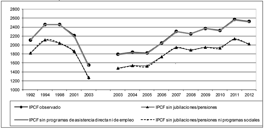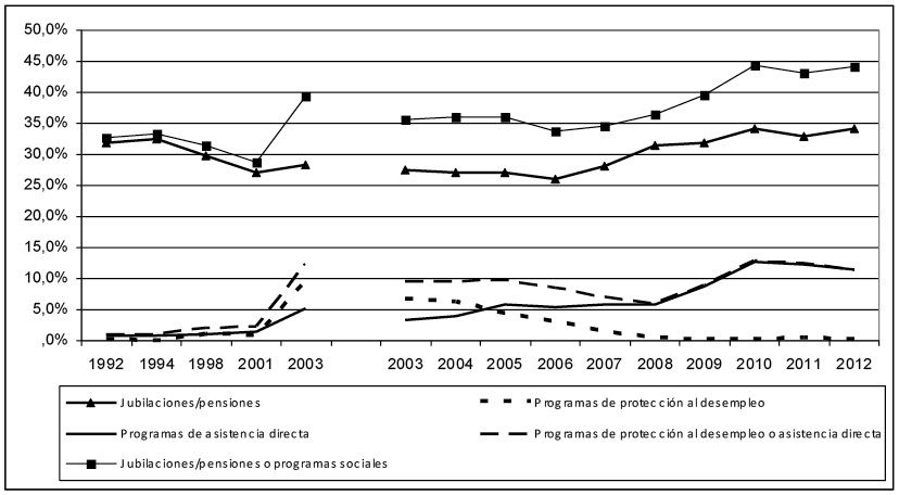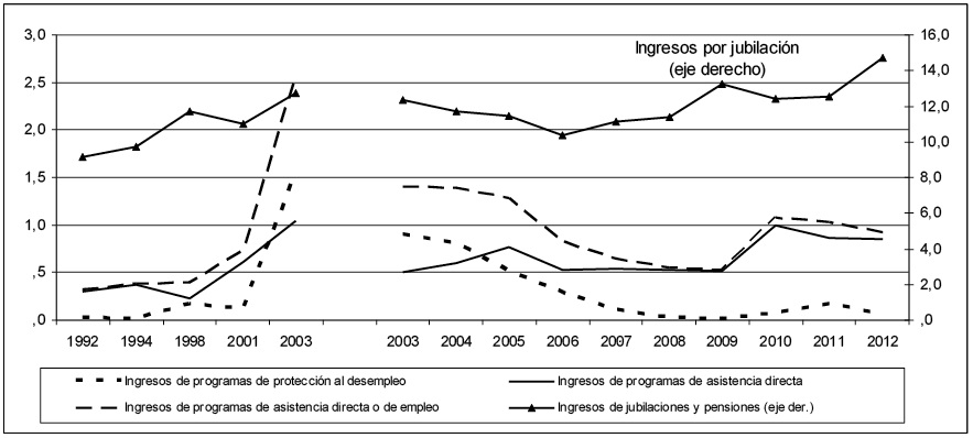 En este apartado interesa evaluar el impacto específico que tuvieron las transferencias previsionales (el sistema de jubilaciones y pensiones) y los instrumentos de promoción y asistencia social directa —caracterizados como programas de protección contra la pobreza— sobre los niveles de ingreso familiar y la desigualdad bajo distintas fases político-económicas del periodo 1992-2012.