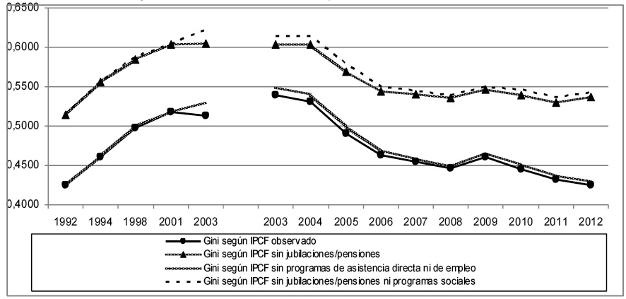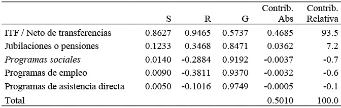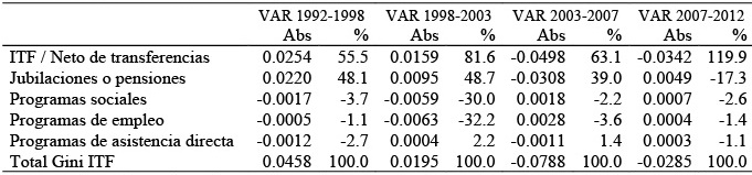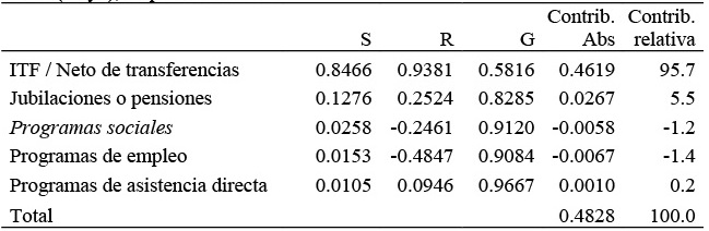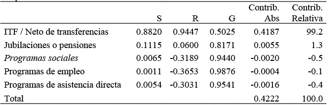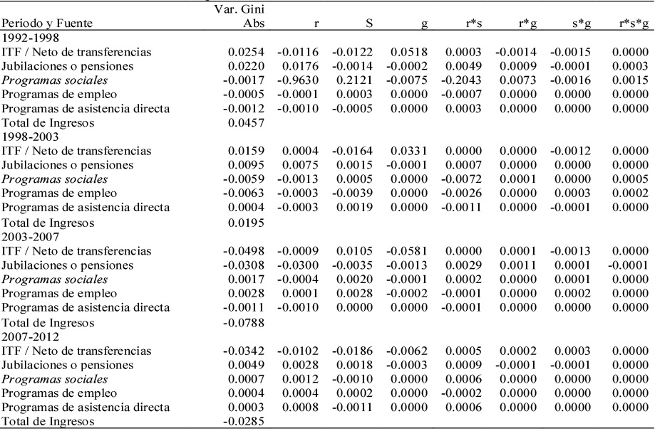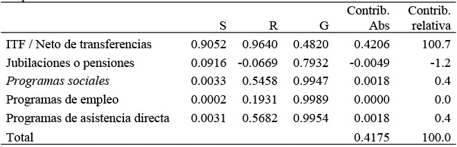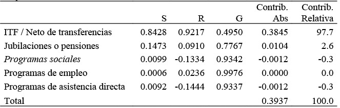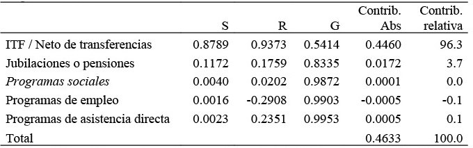 Se aplicó un ejercicio de descomposición del coeficiente de Gini para cuantificar el aporte de cada una de estas fuentes a la desigualdad. Durante la década neoliberal, en el marco del proceso de privatización del sistema de la seguridad social, las jubilaciones y pensiones aportaron a una mayor desigualdad; mientras que los programas de lucha contra la pobreza operaron en sentido contrario. En un contexto de deterioro generalizado como de los ingreso, como fue la crisis 2001-2002, ambas transferencias operaron amortiguando el aumento de la desigualdad. Durante los primeros años de la década pos-reformas, las transferencias de la seguridad social habrían coadyuvado en la reducción de la desigualdad, al igual que los programas de asistencia directa.