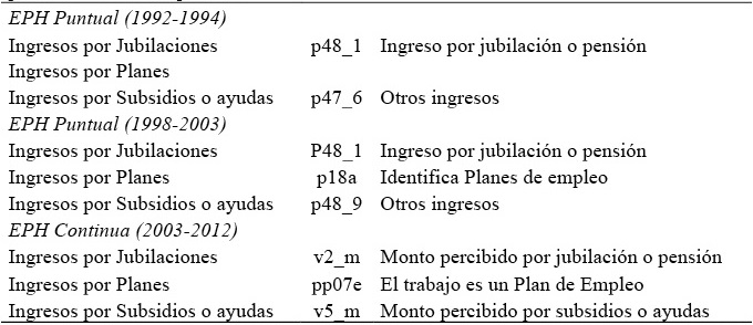 Debido a los aspectos señalados, el análisis se limitó al área metropolitana del Gran Buenos Aires (GBA). Los años seleccionados corresponden a las ondas del mes de mayo de 1992, 1998 y 2003 (EPH “puntual”) y al tercer trimestre de 2003, primer trimestre de 2004 y segundos trimestres de 2005 a 2012 (EPH “continua”). Dado que algunos de los ejercicios planteados en este trabajo contienen un nivel elevado de complejidad metodológica, se consideró que el empalme de datos entre la EPH “puntual” y “continua” podría resultar distorsivo y, por ende, menos fiable. Al mismo tiempo, la falta de información en los años 1992 y 1994 respecto a los ingresos por ayudas/subsidios no laborales obligó a trabajar en estos años con datos estimados (en base al peso que adquiere esta fuente en el total de ingresos no laborales en los años sucesivos). Por estos motivos, el análisis se desarrolló a través de una serie “cortada” de resultados: 1992-1994, 1994-1998, 1998-2003 y 2003-2012 (este último periodo, subdividido por razones teóricas en 2003-2007 y 2007-2012).