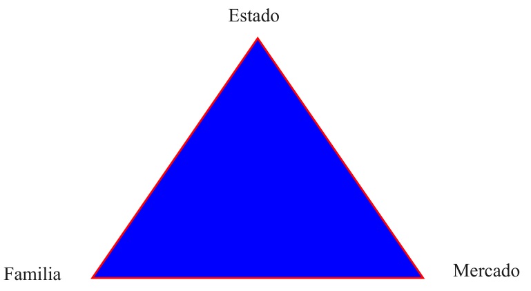 Con este propósito, resulta útil identificar el tipo de necesidades que deben ser satisfechas a lo largo del ciclo de vida de los individuos y la manera en que éstas son satisfechas a través de distintos arreglos institucionales. Gráficamente se pueden representar en un triángulo estos arreglos institucionales ocupando cada uno de sus vértices los ámbitos que les dan origen, de tal manera que en su superficie se ubique la organización que responde a determinadas necesidades según la preeminencia que adquiere el Estado, la familia o el mercado.