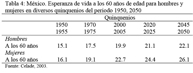Se observa en la Tabla 4 que una persona que alcance los 60 años de edad, es posible que viva en la actualidad en promedio alrededor de 20 años y en el caso de las mujeres que viva aún más. Sin embargo, también es probable, que enfrente situaciones de discapacidad cada vez más graves conforme envejezca. Una proporción importante de las discapacidades se origina en el efecto de las enfermedades crónico-degenerativas y las lesiones que se producen los viejos en sus propios hogares o en su entorno cercano.