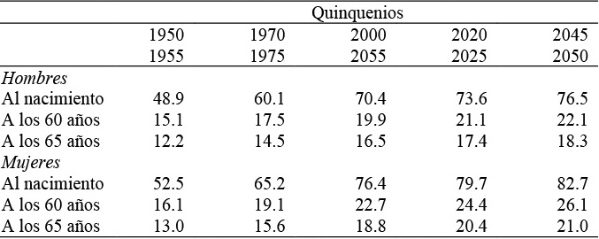 Por lo que hace a la evolución de la esperanza de vida, su incremento es evidente a lo largo del periodo representado en la Tabla 2 y es una muestra objetiva del abatimiento de los riesgos de muerte prematura y la ampliación, especialmente significativa, de la sobrevivencia en la vejez.