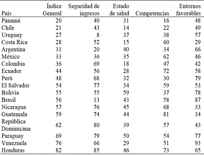 Sin tener la intención de describir la metodología para la construcción de este Índice, que está basado en los procedimientos usados en la construcción del índice de Desarrollo Humano del Programa de Naciones Unidas para el Desarrollo,11 vale la pena destacar los aspectos conceptuales que le dan origen y específicamente sus cuatro componentes que reflejan las condiciones de vida de los viejos: i) seguridad de ingresos, ii) estado de salud, iii) competencias y iv) entornos favorables.