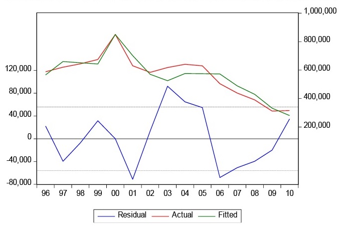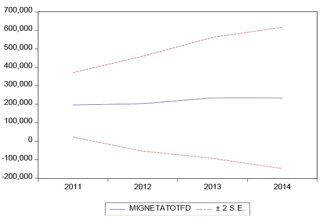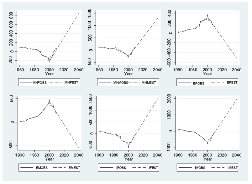 Así, una vez confirmado que todas las series temporales migratorias son estacionarias con rompimientos pretendemos definir un modelo ajustado a los datos observados de la MNM, con el cual se pueda pronosticar tal variable a un horizonte hasta el año 2040, luego a partir de tal insumo incorporado en el modelo ARDL(8,8) obtener el pronóstico de la MNF para el periodo 2011-2040. Este pronóstico asume que los rompimientos han definido una especie de ciclo de largo plazo.