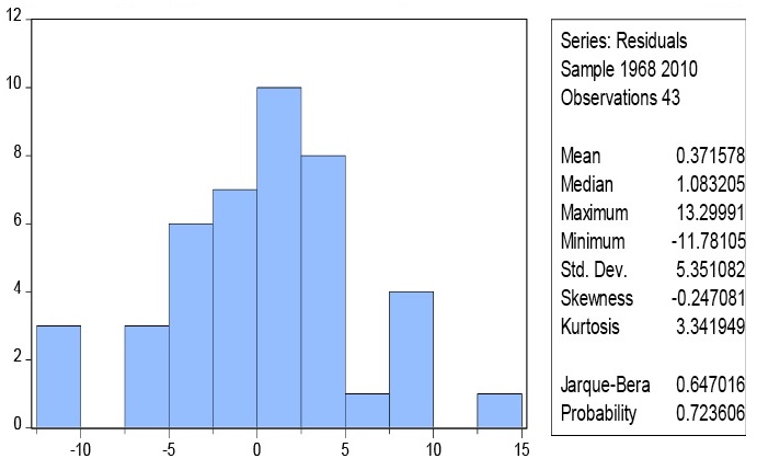 Esta regresión supera todas las pruebas de autocorrelación de los residuos, de los residuos al cuadrado del multiplicador de Lagrande de Breusch-Godfrey, por lo menos a cinco por ciento de significancia; lo mismo con normalidad y con heteroscedasticidad.