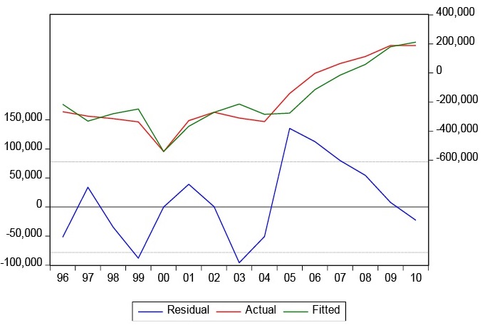 Como concluimos del modelo ARDL(8,8): existe una relación de largo plazo entre la migración neta femenina (MNF) y la migración neta masculina (MNM) en el periodo 1960-2010, donde esta última variable se mueve primero que aquélla, nuestra variable dependiente es MNF y la independiente es la MNM, lo cual se basa en mucho en la reunificación familiar y en las cuestiones de migración laboral.