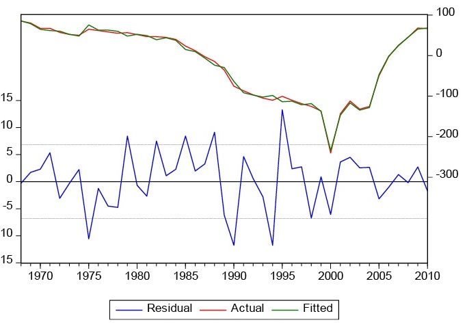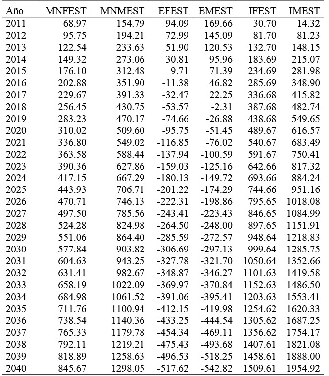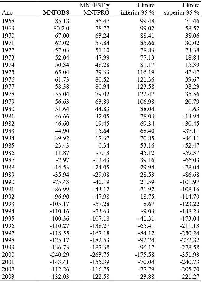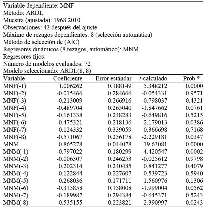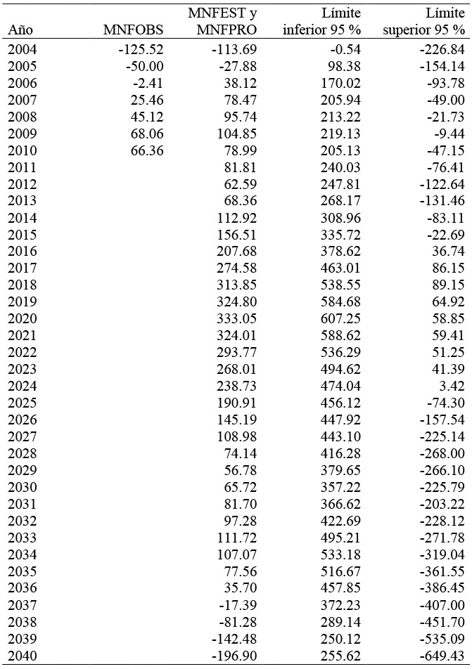 Nuestro interés especial en el modelo ARMA(2,1) para la serie MNM radica en ser el insumo para el modelo ARDL(8,8), a partir del cual se puede pronosticar la MNF para los treinta años del periodo 2011-2040 (Tabla 13a y Tabla 13b). El modelo ARDL pronosticado se refleja en un MNF positivo y creciente para el periodo 2011-2020, posteriormente en el lapso 2021-2035 la cifra sigue siendo positiva pero decreciente, y en los cinco últimos años del horizonte de pronóstico la MNF es negativa (Tabla 14).