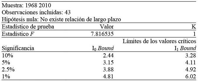 Giles (2013) explica que la utilidad de este modelo es permitir evaluar si existen relaciones de largo plazo entre las series de tiempo estudiadas cuando tenemos dudas del orden de integración de las mismas, pero el mismo no es igual o superior a dos. Con el modelo estimado estable se hacen las pruebas de límites (Bounds tests) propuestas por Pesaran et al. (2001), estas pruebas evalúan si los coeficientes de las variables son estadísticamente iguales a cero en el modelo estimado, para ello estima un valor critico que sigue una distribución F. Si el estadístico crítico es mayor al límite superior se concluye que existe una relación de largo plazo, si está por debajo del límite inferior significa que no la hay y si su valor se encuentra al interior del intervalo entonces la prueba no es concluyente.
