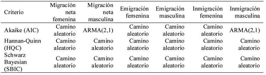 Encontramos que los modelos seleccionados bajo el criterio de Akaike para las series de migración neta masculina e inmigración neta masculina son modelos ARMA (2,1); en tanto que, para las otras cuatro series el AIC indica que son caminos aleatorios; lo mismo ocurre para las seis variables migratorias con el criterio de Hannan-Quinn y con el criterio bayesiano de Schwarz: todod son caminos aleatorios (Tabla 11).