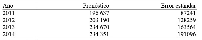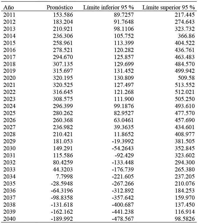 El pronóstico de la MNM para el periodo 2011-2040 a partir del modelo ARMA (2,1) lleva a la Tabla 12, donde también incluimos en límite inferior y el superior del pronóstico para cada año.