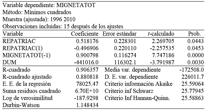 El periodo de estudio es apenas de 21 años, hemos establecido previamente que las series migración neta total (MIGNETATOT) es estacionaria con un rompimiento en 1999, lo mismo para la serie emigración por sexo, aun cuando aquí utilizamos la emigración total (suma de la femenina y masculina); por su parte, al aplicar una prueba de raíz unitaria Dickey-Fuller aumentada a la serie repatriaciones (REPATRIAC) la conclusión es estacionariedad, por lo menos al 95 por ciento de confianza: t-calculado es -4.08 y valor crítico de MacKinnon es -3.67 al cinco por ciento de significancia.