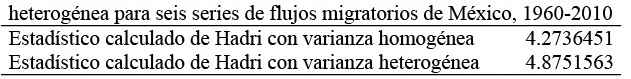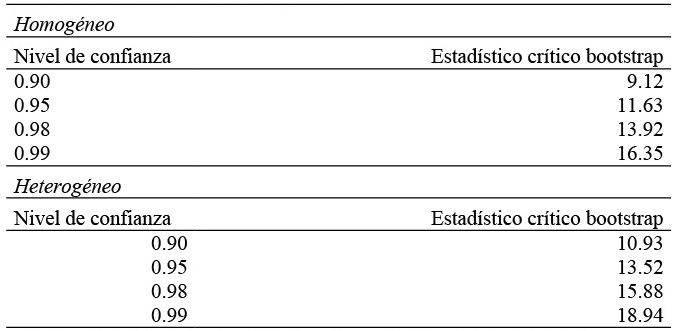 Al ser los estadísticos calculados (Tabla 4) menores que los valores críticos bootstrap con varianzas homogénea y heterogénea (Tabla 5) no podemos rechazar la hipótesis nula de estacionariedad con rompimientos. Esto nos lleva a concluir que no tenemos caminos aleatorios en las series. La confusión se debe a la presencia de rompimientos en las series como explica Hansen (2001).1