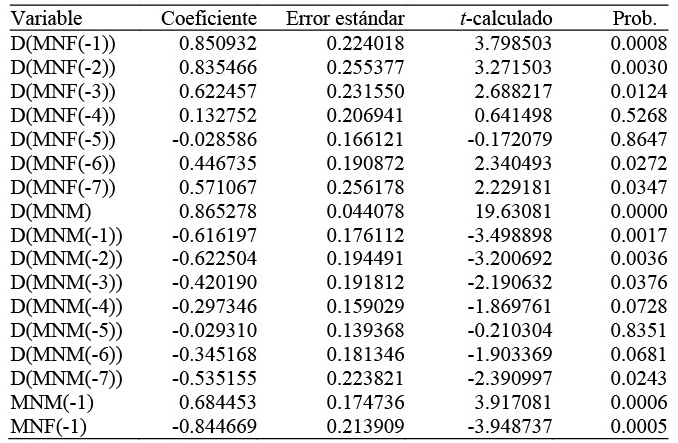 Al aplicar la prueba Bounds Test de Pesaran et al. (2001) podemos rechazar la hipótesis nula de no existencia de relación de largo plazo entre migración neta femenina y migración neta masculina en todos los niveles de significancia, al ser el estadístico calculado (7.816535) superior a todos los valores críticos sin importar el nivel de significancia (Tabla 7).