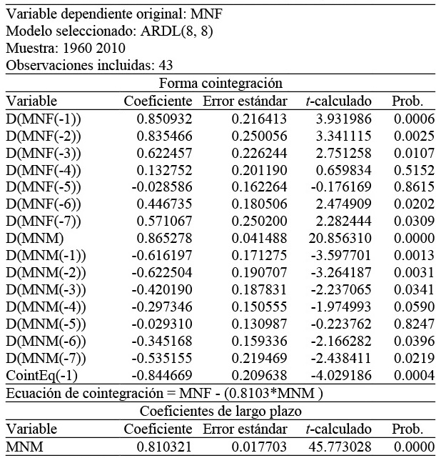 Para examinar si existe una relación de largo plazo entre las variables Migración Neta Femenina (MNF) y Migración Neta Masculina (MNM) para México con datos del periodo 1960-2010, recurrimos a la técnica econométrica ARDL, la cual plantea en su hipótesis nula la no existencia de tal relación, y en hipótesis alternativa la existencia de la misma entre las variables. Cabe aclarar que no fue necesario incorporar variables ficticias o dummy en la estimación para considerar los rompimientos de la migración (Tabla 6).
