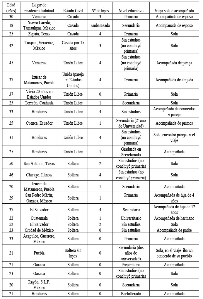 Para tener un conocimiento más exhaustivo de cómo las relaciones desiguales de género inciden en el proceso migratorio desarrollamos un estudio cualitativo basado en los resultados del proyecto titulado “Mujeres migrantes indocumentadas: historias de transgresión, resistencia, sumisión y reacomodo como estrategias de viaje. Una perspectiva socioeducativa” financiado por el Plan Propio de Cooperación de la Universidad Pablo de Olavide.1 La investigación se realizó durante 2011 en el estado norteño de Tamaulipas, México, en tres ciudades fronterizas (Matamoros, Reynosa y Nuevo Laredo). Tales ciudades son los puntos finales de un corredor terrestre ampliamente frecuentado por migrantes centroamericanos y mexicanos. Para ello se llevaron a cabo 26 entrevistas en profundidad a mujeres migrantes indocumentadas localizadas en los albergues de Tamaulipas (Tabla 1); así como 12 entrevistas abiertas a informadores claves–profesionales de distintas dependencias gubernamentales y miembros de la sociedad civil organizada.