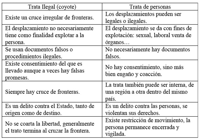 Llegados a este punto es importante hacer la distinción entre tráfico ilegal de personas y trata de personas (Tabla 2).