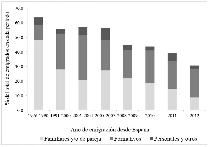 Cabe reseñar, no obstante, una evolución algo diferenciada como principal causa de emigración entre los motivos que integran este subconjunto de modalidades migratorias. Los estudios y la formación han reducido progresivamente su peso relativo en la última década, pasando de representar 20 por ciento entre los emigrados en el primer lustro del siglo actual, a algo menos de 10 por ciento entre los que lo han hecho posteriormente, alcanzando sus niveles más bajos (en torno a siete por ciento) entre quienes salieron de España en 2011-2012. La ampliación y mejora de la oferta formativa en España, así como el elevado costo de la educación superior en el extranjero, han podido, sobre todo en un contexto de crisis, contribuir a reducir el peso relativo, que no absoluto, de esta forma de migración.