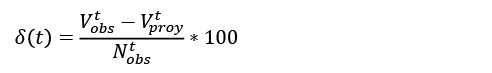 [10]Donde Vtobs es la variación de la población en el año t; Vtproy es la variación de la población proyectada en el año t; Ntobs es la población total observada en el año t, 1985 ≤ t ≤ 2010.