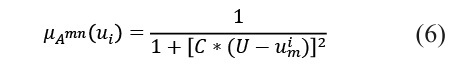 [6]Donde Amn es el conjunto difuso que corresponde a las variaciones entre los años (1895, 2010), C es una constante que en nuestro caso es 0.000001, U es el universo de discurso conformado por las variaciones que se muestran en la Tabla 1 y uim es el punto medio del correspondiente intervalo ui. Los conjuntos difusos se definen en el conjunto universo U.