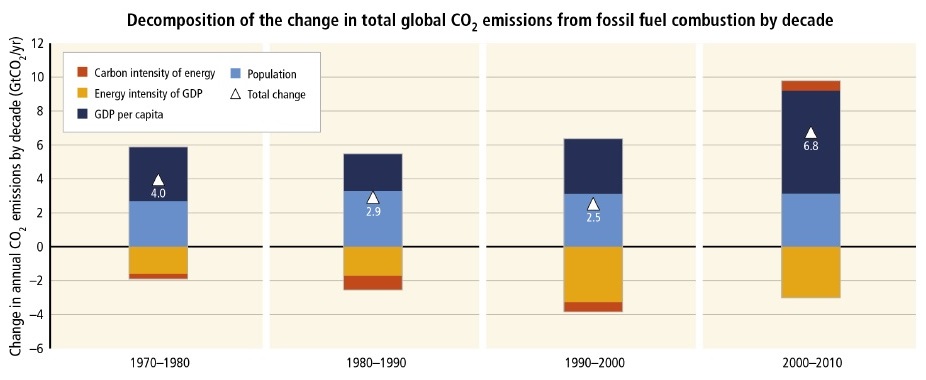 Il recente passato ci mostra la rilevanza dell’azione antropogenica sule emissioni di gas serra. La scomposizione dell’aumento totale di CO2 proveniente dalla combustione di energia fossile, decennio per decennio, tra il 1970 e il 2010, fornisce un risultato assai interessante (International Panel on Climate Change, 2014). La componente “crescita della popolazione” sull’aumento delle emissioni è responsabile all’incirca della metà di tale aumento, l’altra metà essendo imputabile alla crescita del PIL pro-capite. Questa equivalenza vale per gli anni ’70 e ’90; la crescita della popolazione contribuisce invece per quasi i due terzi dell’aumento netto delle emissioni negli anni ’80, e all’incirca un terzo nel primo decennio di questo secolo. L’aumento delle emissioni è al netto dell’effetto riduttivo delle emissioni dovuto al progresso tecnologico (misurato dall’intensità energetica contenuta in ogni unità di prodotto), che grosso modo controbilancia l’effetto popolazione. E’ evidente che la crescita della popolazione mondiale, pur in rallentamento, continuerà ad essere responsabile nei prossimi decenni di una quota dell’aumento delle emissioni di un equivalente ordine di grandezza. Più lenta la crescita della popolazione, più lenta la crescita delle emissioni.