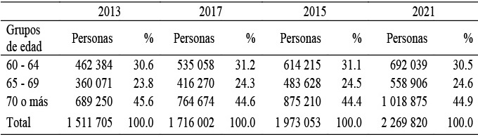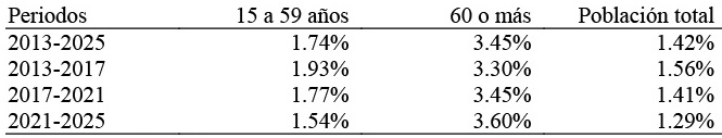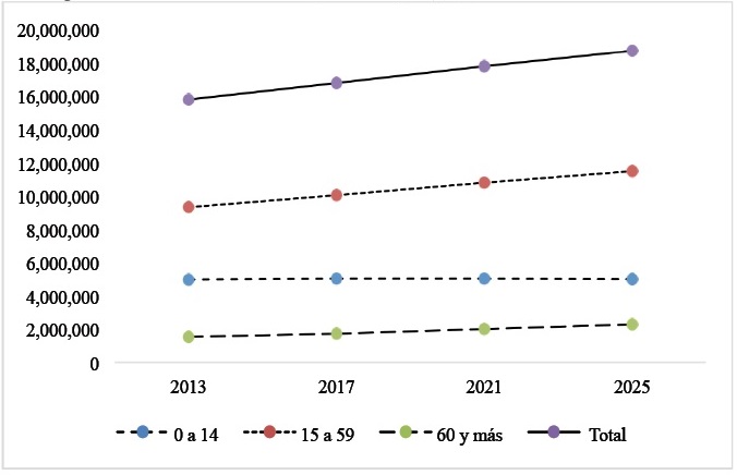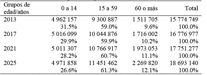 Las personas mayores de 60 años que constituyen parte del grupo de dependencia experimentan un crecimiento de 50 por ciento (758 115 de personas), pasando de 1 511 705 personas en el año 2013 a 2 269 820 en el año 2025. Este crecimiento se explica por el grupo de población de 65 a 69 años de edad que pasan de representar 23.8 por ciento en el año 2013 a 24.6 por ciento en el año 2015, lo que supone un aumento de 0.8 puntos. A diferencia de este grupo de población, las personas con edades comprendidas entre 60 y 64 años y los mayores de 70 años muestran reducciones de 0.1 y 0.7 puntos, respectivamente (Tabla 11).