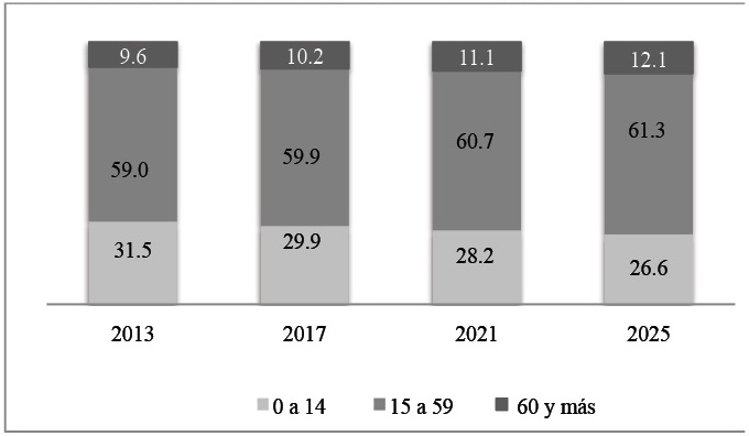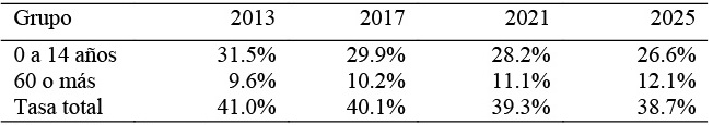 Se define a la tasa de dependencia como el porcentaje de población inactiva de edad inferior a 15 años o mayor de 60 años con respecto a la población activa de edades comprendidas entre los 15 y 59 años, las proyecciones indican una disminución de la misma en 2.3 puntos, pasando de 41 por ciento en 2013 a 38.7 por ciento en 2025. Este descenso se explica, principalmente, por la reducción de la tasa de dependencia del grupo de 0 a 14 años de edad (4.9 puntos) (Tabla 10).