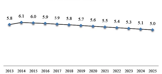 La relación entre el número de personas en edad de trabajar respecto del número de personas potencialmente pensionistas presenta una relación negativa, esto es decreciente. Esto indica que si en el año 2013 había 5.8 personas en edad de trabar por cada persona de 60 o más años, en el año 2025 la proporción disminuye de forma que existirán cinco personas en edad de trabajar por cada persona mayor de 60 años (Figura 5).