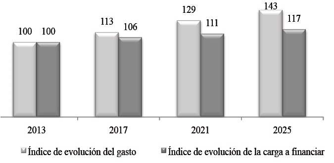 La carga a financiar aumentará en 39.69 dólares por cotizante en el periodo 2013-2025, lo que supone un incremento de 16.5 por ciento. En el año 2013 el valor a financiar por cada cotizante ascendió a 240.49 dólares, mientras que para el año 2025 dicho valor se sitúa en 280.18; la carga a financiar en los años 2017 y 2021 será de 252.26 y 267.57 dólares por cotizante, respectivamente (Tabla 17). Estos acrecentamientos se explican por el incremento de la población mayor de 60 años que percibe una pensión de jubilación y, en bastante menor medida, a las personas que estando en edad de trabajar ingresan en el sistema de pensiones por jubilación.
