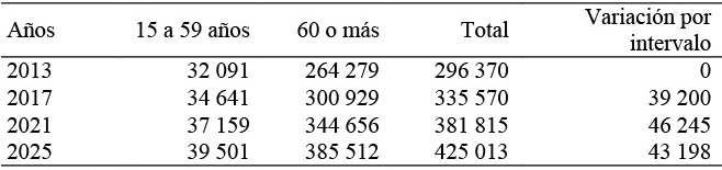 Debido a la implementación de las tasas de variación media anual acumulativa, el número de pensiones de jubilación crecerá 43.4 por ciento, pasando de 296 370 a 425 013 pensiones durante el periodo 2013-2025. El crecimiento medio anual de 1.93 por ciento para la población de 15 a 59 años indica un incremento de 2 550 pensiones; por su parte, la población mayor de 60 años presenta una tasa anual acumulativa de 3.6 por ciento, lo que supone un incremento de 40 865 pensiones (Tabla 13).