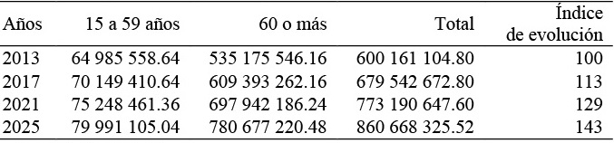 Las estimaciones realizadas muestran un crecimiento de 43.4 por ciento del gasto en pensiones entre 2013 y 2025, del cual 90.7 por ciento corresponde al gasto en personas de 60 o más años, mientras que el restante 9.3 por ciento corresponde a jubilaciones de la población de 15 a 59 años. Entre los años 2013 y 2017 el gasto en pensiones presenta un Índice de Evolución de 113 puntos, mientras que para el año 2021 el Índice crece en 15 puntos situándose en 129 puntos. En términos absolutos el incremento del gasto en pensiones del año 2013 al año 2017 asciende a 79 381 568 de dólares; entre 2017 y 2021 el incremento es de 93 347 974.80 de dólares y entre 2021 y 2025 de 87 447 677.92 de dólares. En suma, el gasto en pensiones de jubilación en Ecuador aumentará en 260 507 220.70 2de dólares en los próximos doce años.