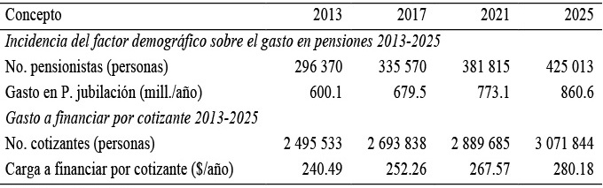 En el año 2025 el número de pensionistas ascenderá a 425 013 con un gasto total en pensiones de 860.6 millones de dólares, por lo que deberán existir un total de 3 071 844 cotizantes para afrontar la viabilidad financiera del sistema.