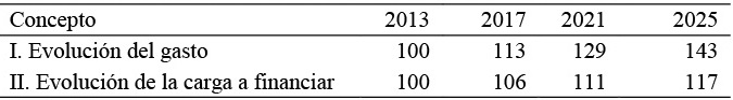 El gasto en pensiones es el elemento a determinar por medio de las proyecciones tomando como referencia las variables: número de pensionistas y cotizantes. Como año base se toma 2013, en el que el gasto en pensiones ascendía a 600.1 millones de dólares,10 16 por ciento menor que el gasto asignado en el año anterior.