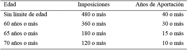 Si la persona no quiere tener en cuenta el requisito de la edad, es necesario que, al menos, haya realizado 480 imposiciones y tenga 40 años de aportaciones. El número de imposiciones y los años mínimos de aportación disminuyen a partir de los 60 años de edad, alrededor de 25 por ciento respecto de los menores de dicha edad y dos terceras partes entre los 60 y 70 años. Concretamente, se exigen 360 imposiciones y 30 años de aportación si el pensionista tiene entre 60 y 65 años; 180 imposiciones y 15 años de aportación si tiene entre 65 y 70 años; y 120 imposiciones y 10 años de aportación si supera los 70 años.