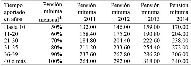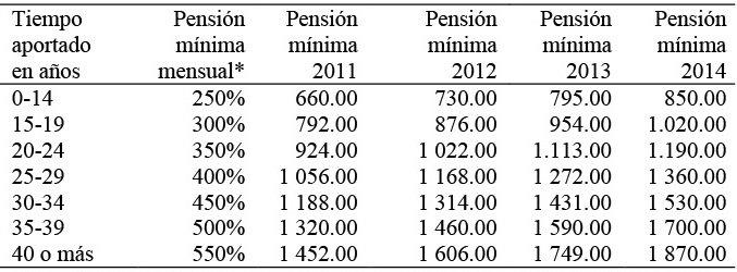 Las pensiones mínimas y máximas de vejez se establecen de acuerdo con el número de años de aportación en proporción al salario básico unificado mínimo del trabajador en régimen general, cuya cuantía en el periodo 2011-2014 se recoge en la Tabla 4.