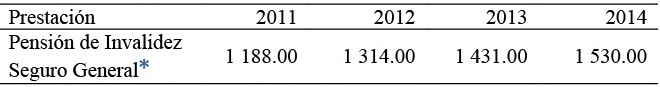 Las pensiones mínimas de discapacidad e invalidez se establecen de igual forma que las pensiones de jubilación, con los mismos criterios y cuantías. Por su parte, en lo referente a las pensiones máximas, el afiliado percibe 450 por ciento de su salario básico, de forma que el valor de la pensión de invalidez era de 1 188 dólares en el año 2011, de 1 314 dólares en el año 2012, de 1 431 dólares en el año 2013 y de 1 530 dólares en el año 2014 (Tabla 7).