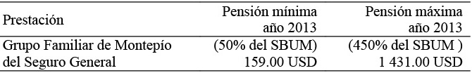 La pensión del grupo familiar de montepío no puede ser inferior a 50 por ciento del Salario Básico Mínimo Unificado (SBMU), ni mayor a 450 por ciento del mismo.