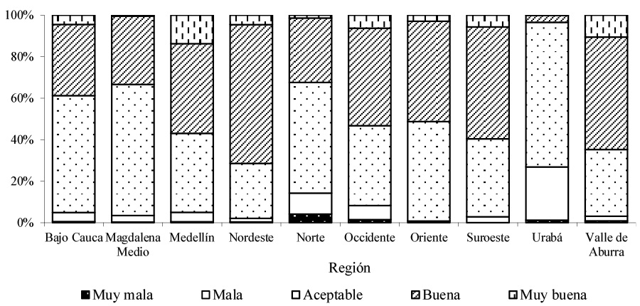 En la región de Urabá se registró la mayor proporción de adultos mayores que calificaron como mala su calidad de vida actual (8.5 por ciento), en Magdalena Medio se encontró un reporte de calidad de vida regular (64.3 por ciento), en Valle de Aburrá el porcentaje mayor fue para la buena calidad de vida (69.9 por ciento) y en Medellín se registró la mayor percepción de muy buena y excelente calidad de vida con 17.9 y 6.5 por ciento, respectivamente (Figura 1).