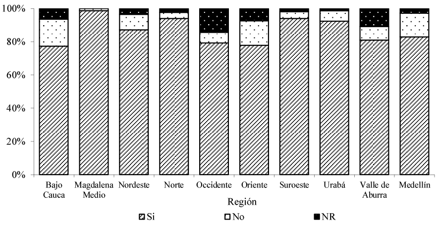 En relación con el cuidado en caso de enfermedad o incapacidad, 86.6 por ciento de los adultos mayores consideran que tendrían a alguien que les prestaría ayuda en caso de enfermedad o incapacidad y sería principalmente la hija (33.9 por ciento), hijo (14.8 por ciento), esposa/esposo (12.3 por ciento), hermana/hermano (7.9 por ciento), o amiga (2.1 por ciento). Es llamativo que 8.4 por ciento considera que nadie lo ayudaría y cinco por ciento restante no contesta. Por subregión, 98.7 por ciento de los adultos mayores del Magdalena Medio tendría cuidador y en Bajo Cauca, 16.2 por ciento considera que no tendría a nadie que desee o que sea capaz de ayudar (Figura 2).