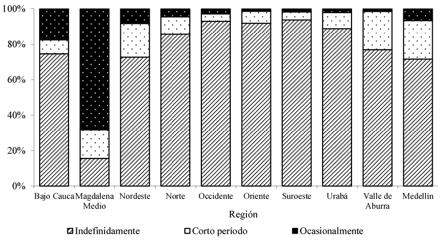 El cuidado según tiempo de ayuda en caso de necesitarlo, fue de forma indefinida para 74.7 por ciento, por un período corto de tiempo tendría ayuda, 12.2 por ciento y para 13.1 por ciento restante solo tendría ayuda de vez en cuando, por ejemplo, para acompañar al médico o haciéndole una comida ocasionalmente. Esto indica que uno de cada cuatro adultos mayores no tendría quien le brindara cuidados en forma definitiva, siendo más llamativa la falta de apoyo en la subregión de Magdalena Medio, frente a Norte y Oriente (Figura 3).