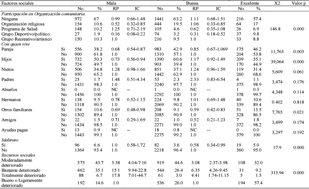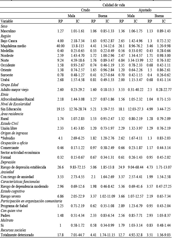 La percepción de mala calidad de vida de las personas con dependencia moderada pasó de 2.96 a 5.36 (IC95% 0.69; 41.6); los adultos que participan en programas de salud, de quienes viven con sus padres y de aquellos que reciben algún tipo de maltrato también mostraron aumento considerable después del ajuste. En contraste a esto, se observó disminución importante en la percepción de mala calidad de vida, en los adultos con ingresos provenientes de subsidios (RP ajustado = 2.62, IC95% 1.67; 4.11), con estado cognitivo (sintomatología emocional) severo (RP ajustado = 3.66, IC95% 1.07; 12.57) y en las personas con recursos sociales totalmente deteriorados (RP ajustado = 12.07, IC95% 4.92;32.8) (Tabla 7).