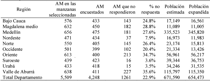 Los factores de expansión fueron utilizados para reconstruir la población de referencia. Estos factores se calculan con base en las probabilidades finales de selección de los adultos mayores, que residen en una manzana específica, de uno de los municipios seleccionados dentro de cada región. Finalmente, la población expandida debe aproximarse a la población de referencia que en este caso fue de 654,473, con una tasa de no respuesta global de 22.9 por ciento (Tabla 1).