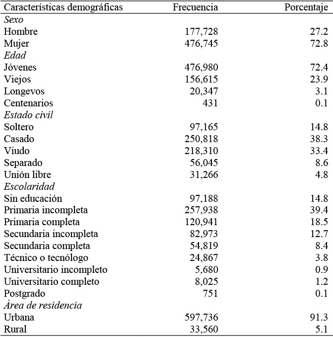 De la población adulta mayor del departamento, 72.8 por ciento son mujeres, por cada hombre hay 2.67 mujeres. Las regiones donde más se registra población femenina son Medellín, Valle de Aburrá y Oriente; en lo que tiene que ver con el estado civil, predominó el casado seguido de los viudos. El 72.7 por ciento de los adultos mayores tenía como máximo nivel de educación la primaria completa y 14.8 por ciento no había alcanzado ningún grado de instrucción. La mayor proporción de adultos mayores están ubicados en el área urbana (Tabla 2).